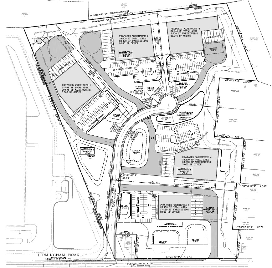 New proposed 150k SF industrial campus of 5 warehouse/distribution center/office bldgs on 26 acres